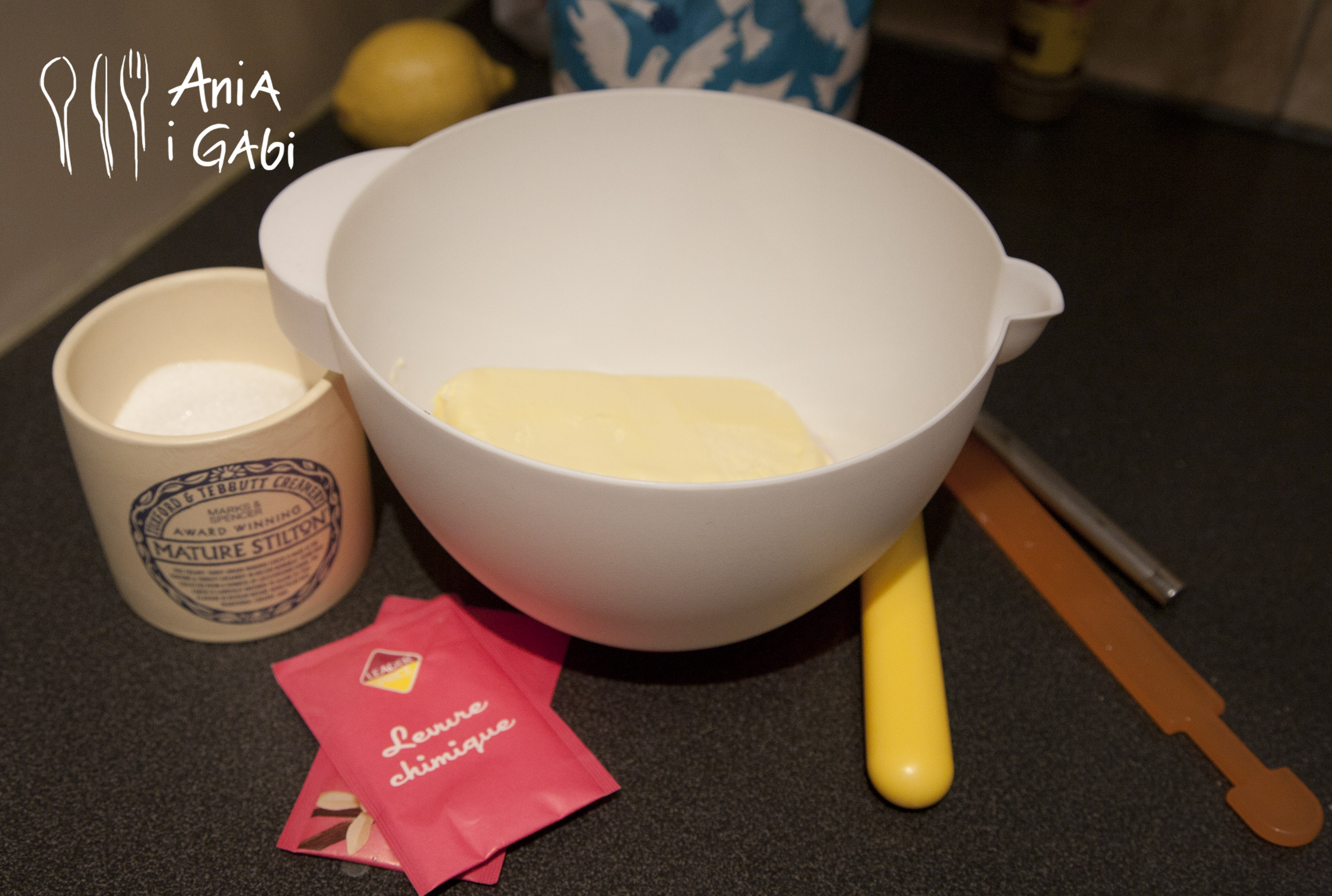 1. Masło i cukier ucieramy w jednej misce. W naszym przypadku masło zostało rozpuszczone w mikrofalówce i połączone (nie mikserem) z cukrem. Piszę o tej profanacji, żeby pokazać Wam,że nie zawsze pieczenie to niekończąca się droga przez mękę. Czasem jest to całkiem fajna droga na skróty ;)
