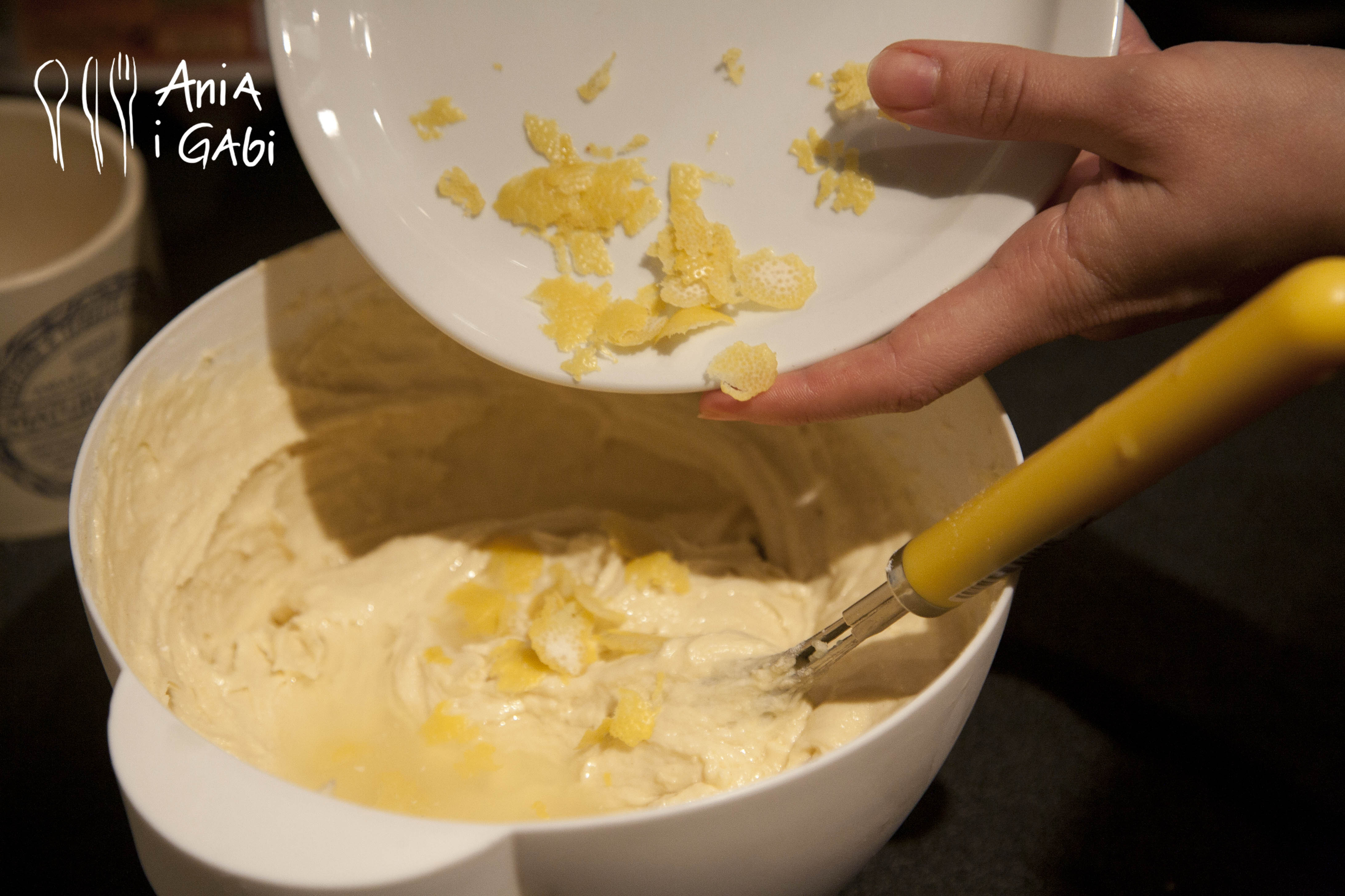3. Zanim dodamy cytrynę, do masy dodajemy pojedynczo 4 jajka, po każdym intensywnie mieszamy masę.